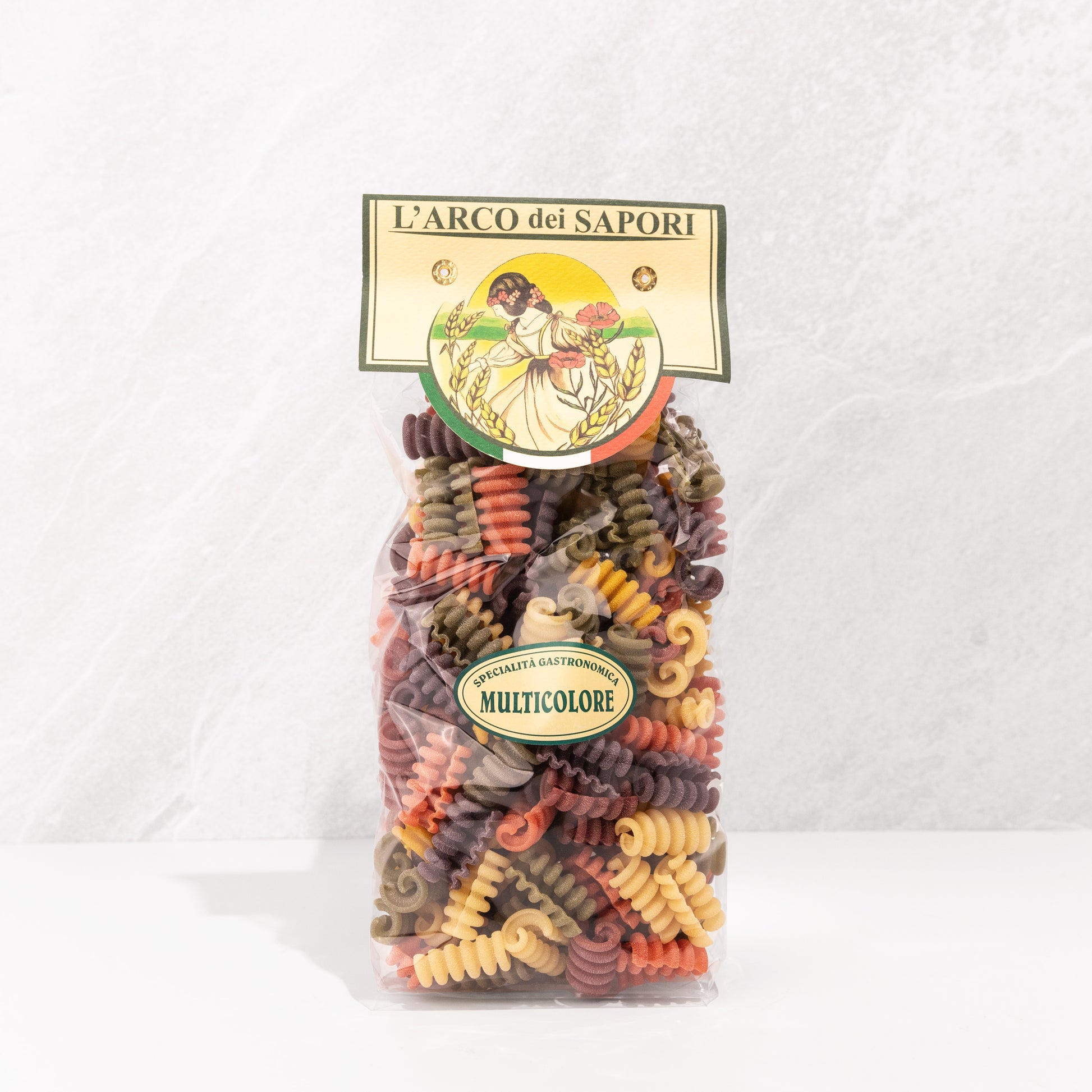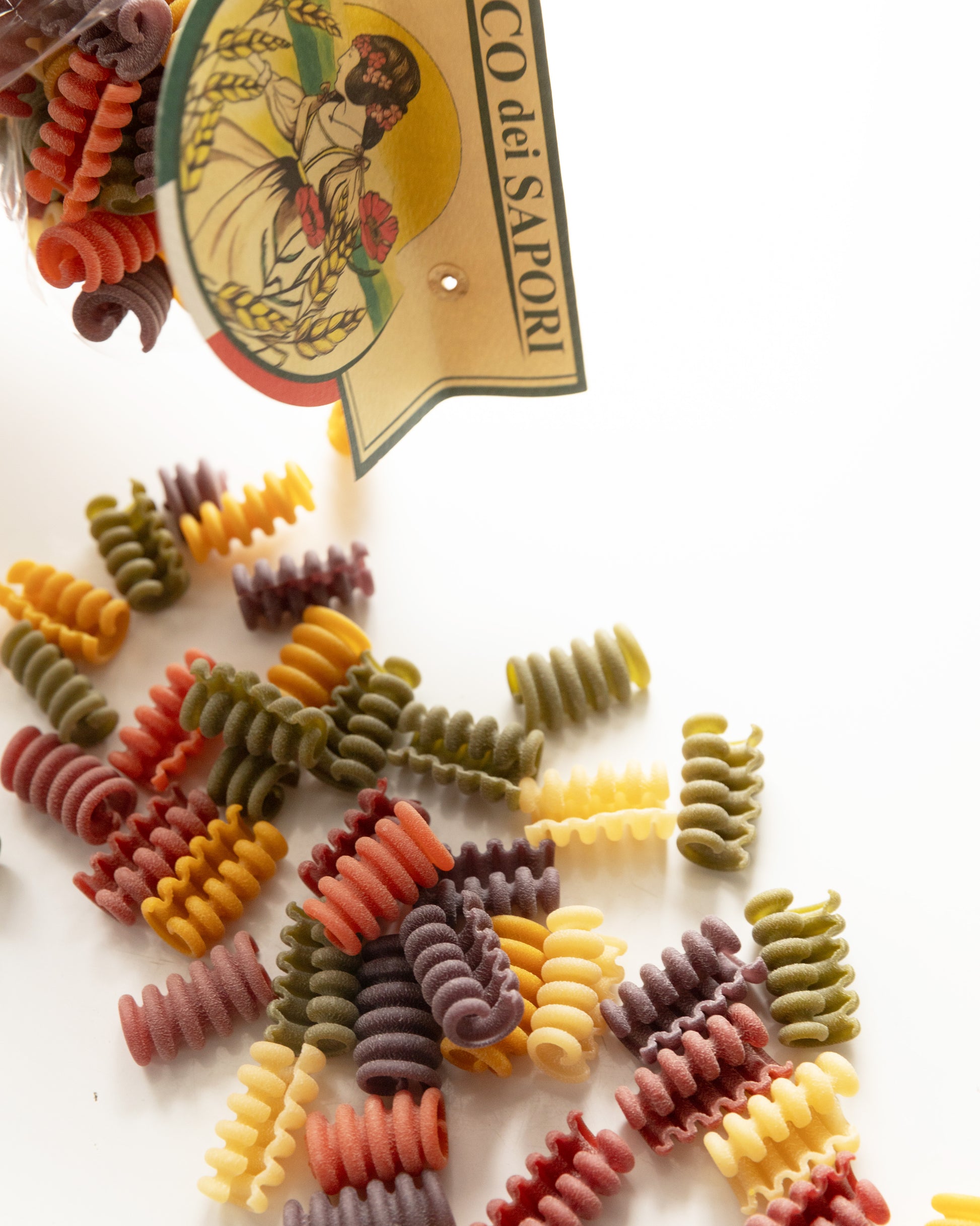Durum wheat semolina, black carrot, tomatoes, spinach, curcuma and red beet (powdered dried) 2%.