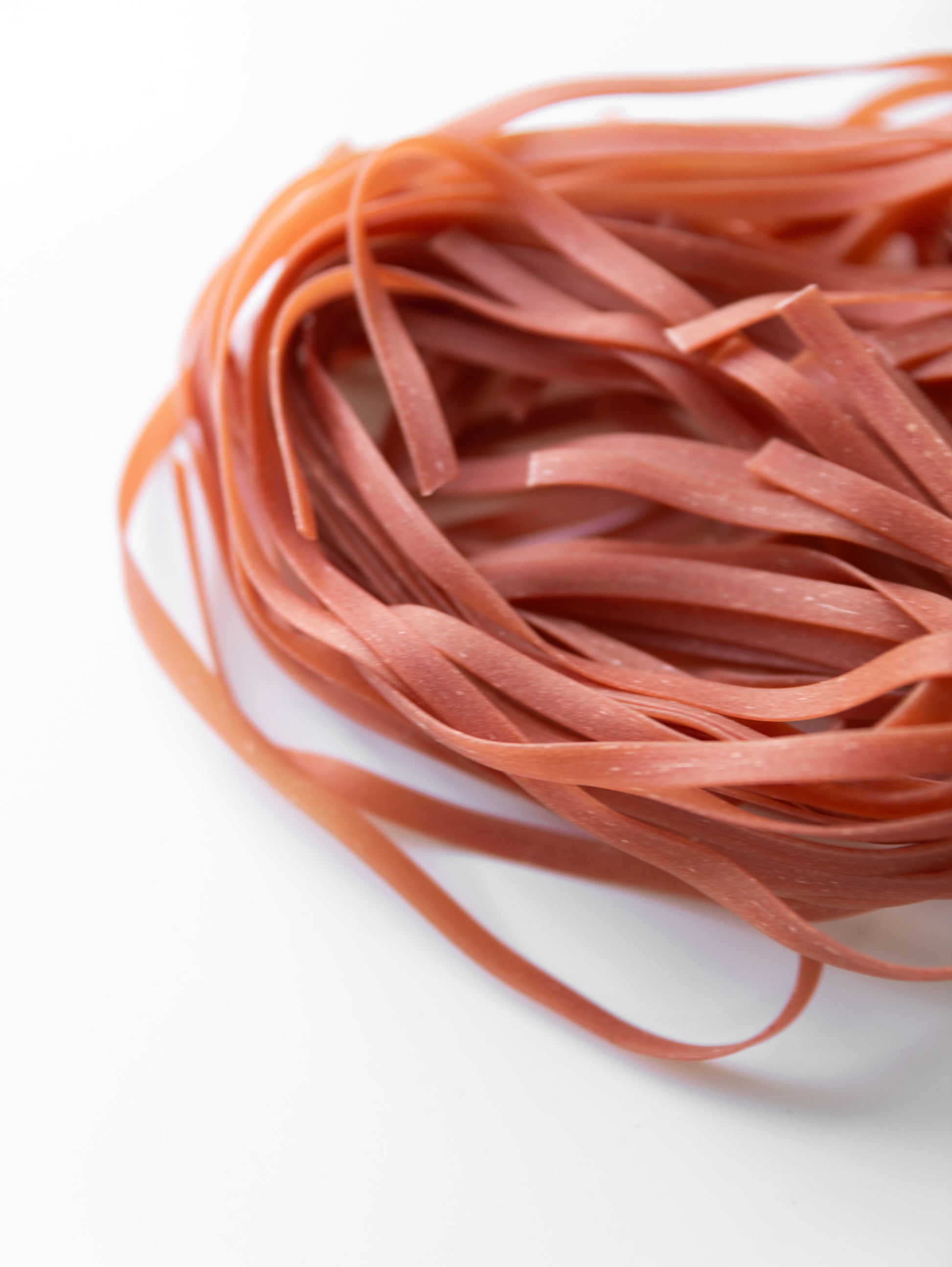 Ingredients for DOCG Barolo Wine infused Tagliatelle: Durum wheat semolina, Barolo wine DOCG 3%, red beet (powdered dried).